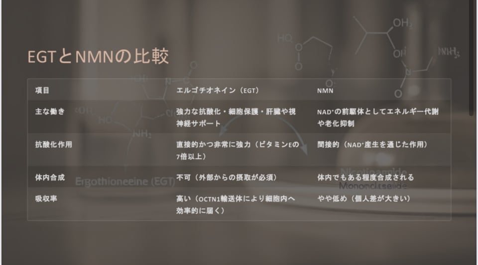 エルゴチオネイン(EGT)は、キノコなどに含まれる天然のアミノ酸誘導体で、強力な抗酸化力を持ち、体内の酸化ストレスを直接抑制する次世代成分です。